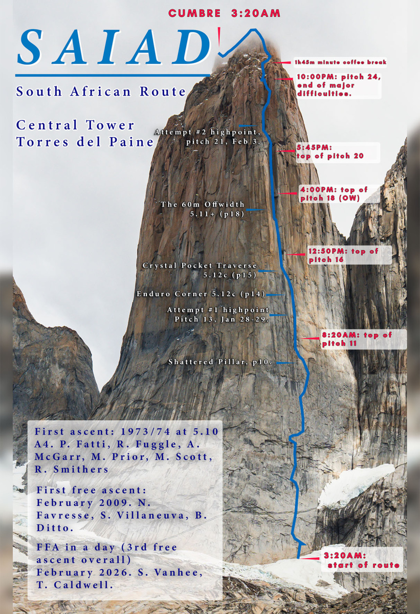 Belgian climber Siebe Vanhee and American climber Tommy Caldwell have successfully completed the 3rd free ascent of the South African Route on the East Face of the Central Tower of Paine, in Patagonia.
