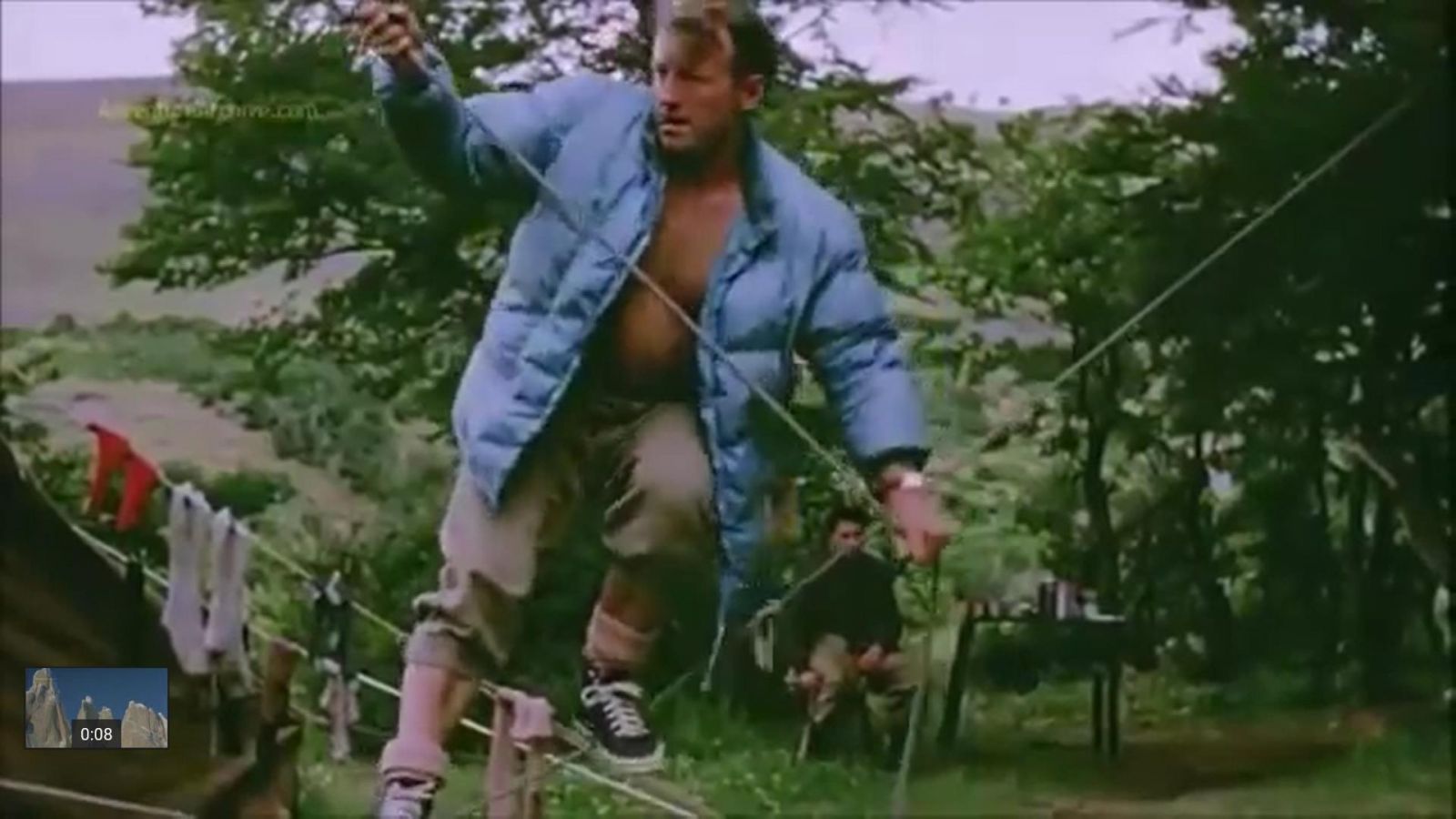 Don Whillans ‘slack-lining’ in Patagonia during the trip. Sceen grab from film