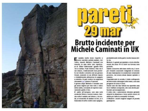 In an on-line report published yesterday it appears that Michele Caminati has taken a ground-fall off Elder Statesman (E7 7b) at Curbar.