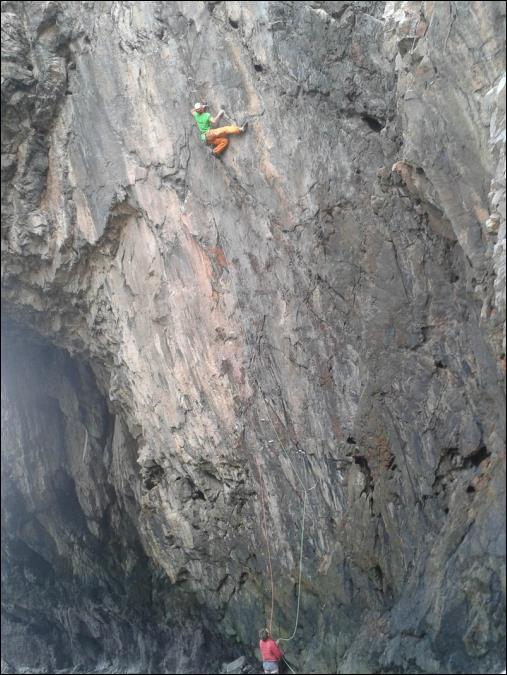 Steve, having narrowly missed out on his uber Malham project before the temperature rose and signalled a cessation of hard redpointing for the summer at The Cove, has switched his attention to other objectives and headed off down to Pembroke for a week-long trip. CLIMBER spoke to Steve before he left and it certainly looked as though he’d had got more than one eye fixed on Mawson’s 2014 Flimston Bay testpiece. As it’s turned out Steve has wasted no time and got stuck straight into Choronzon. Yesterday, and in double-quick-time, the news was that Steve had topped out on Choronzon.