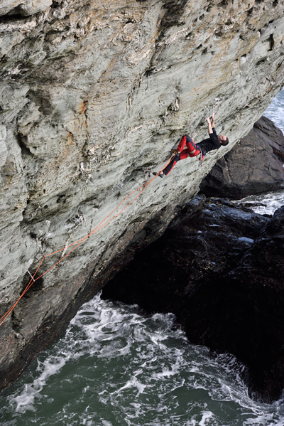 Capitalising on last weekend’s sunny weather, James ‘Caff’ McHaffie added The Gravity Wave (E8 6c) to the short but severely overhanging ‘Face of Adversity’ at Trearddur Bay, Anglesey.