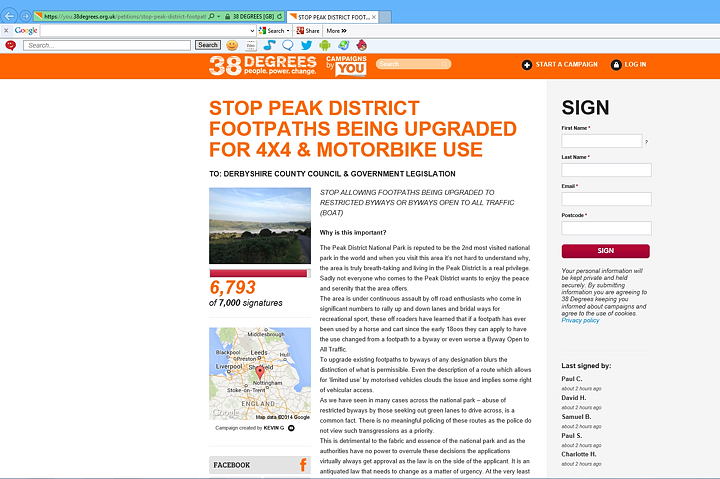 The on-line campaign against the upgrading of Peak District footpaths to allow use by motorcycles and 4x4’s has gathered significant support since it was launched. Currently, the campaign has 6,793 signatures against the proposal to upgrade the footpaths, just short of the 7,000 signatures needed to force a public debate on the issue.
