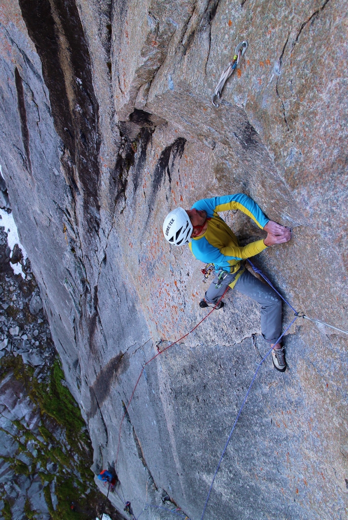 With more poor weather moving in Muskett opted to descend so that Cook and MacLeod – who had already freed more of the route than himself – would have better chances of freeing the remaining pitches. After Muskett descended, Cook and MacLeod pressed-on freeing all the remaining pitches – including some soaked and moss-coated grooves - to arrive at the top long after midnight. Within minutes they were soaked to the skin although clearly elated that they’d freed all the individual pitches.