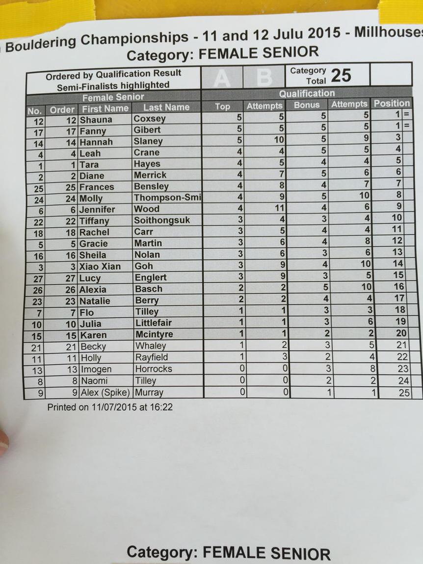 That Shauna Coxsey heads the women’s comp is perhaps no surprise but alongside her in joint first is French and fellow World Cup competitor, Fanny Gilbert. The experienced hands of Leah Crane and Diane Merrick are sitting pretty close too so again the semi’s are going to be a closely-fought round.