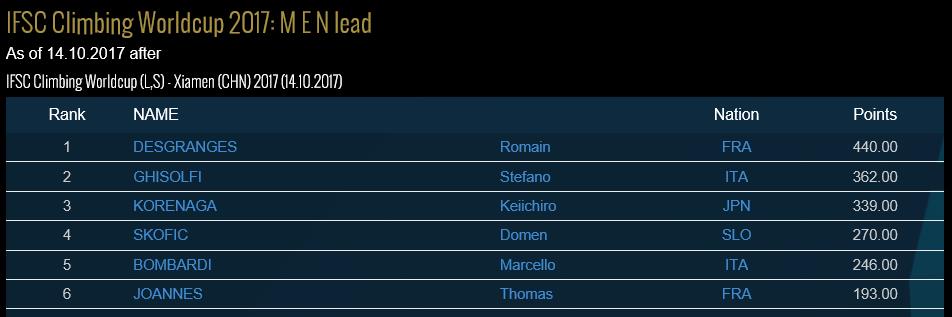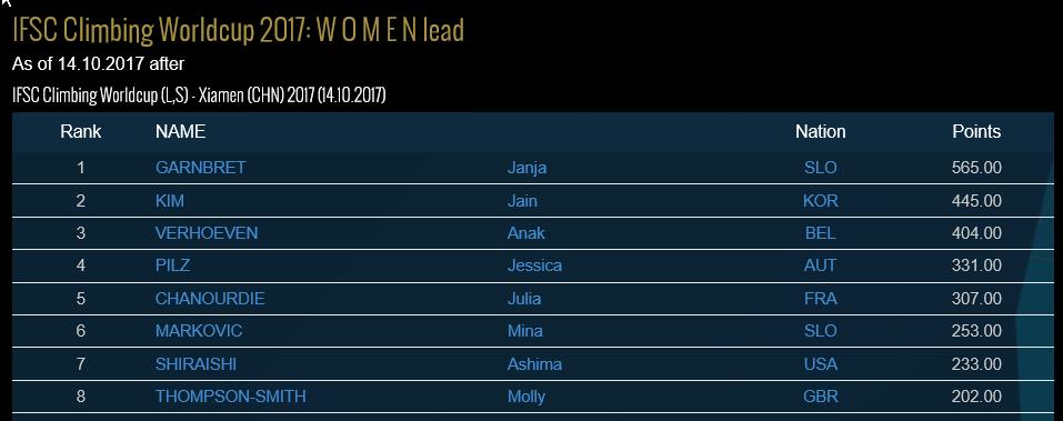 Women’s 2017 standing after Xiamen showing Janja Garnbret with an unassailable lead and Molly in eighth overall – go Molly!!