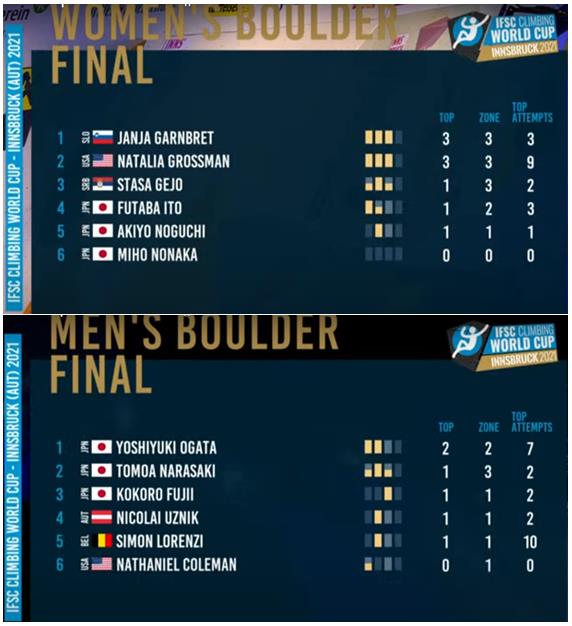 If we’d learnt anything from the earlier WC Boulder events of the year it was that the hitherto dominant Janja Garnbret had not one but two new rivals in the form of Natalia Grossman and Brooke Raboutou – both of whom were on a massive roll following the two SLC events! Remember that Grossman had won both those events with a nearly faultless performance the like of which Garnbret herself usually delivered. Raboutou had also made a name for herself in boulder having collected the Bronze medal in each of those events as well. The fourth WC Boulder event at Innsbruck was therefore nothing if not eagerly awaited!