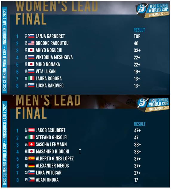 Janja Garnbret scooped gold in both Lead and Boulder at the latest World Cup events at Innsbruck whilst men’s golds go to Schubert (Lead) and Ogata (Boulder).