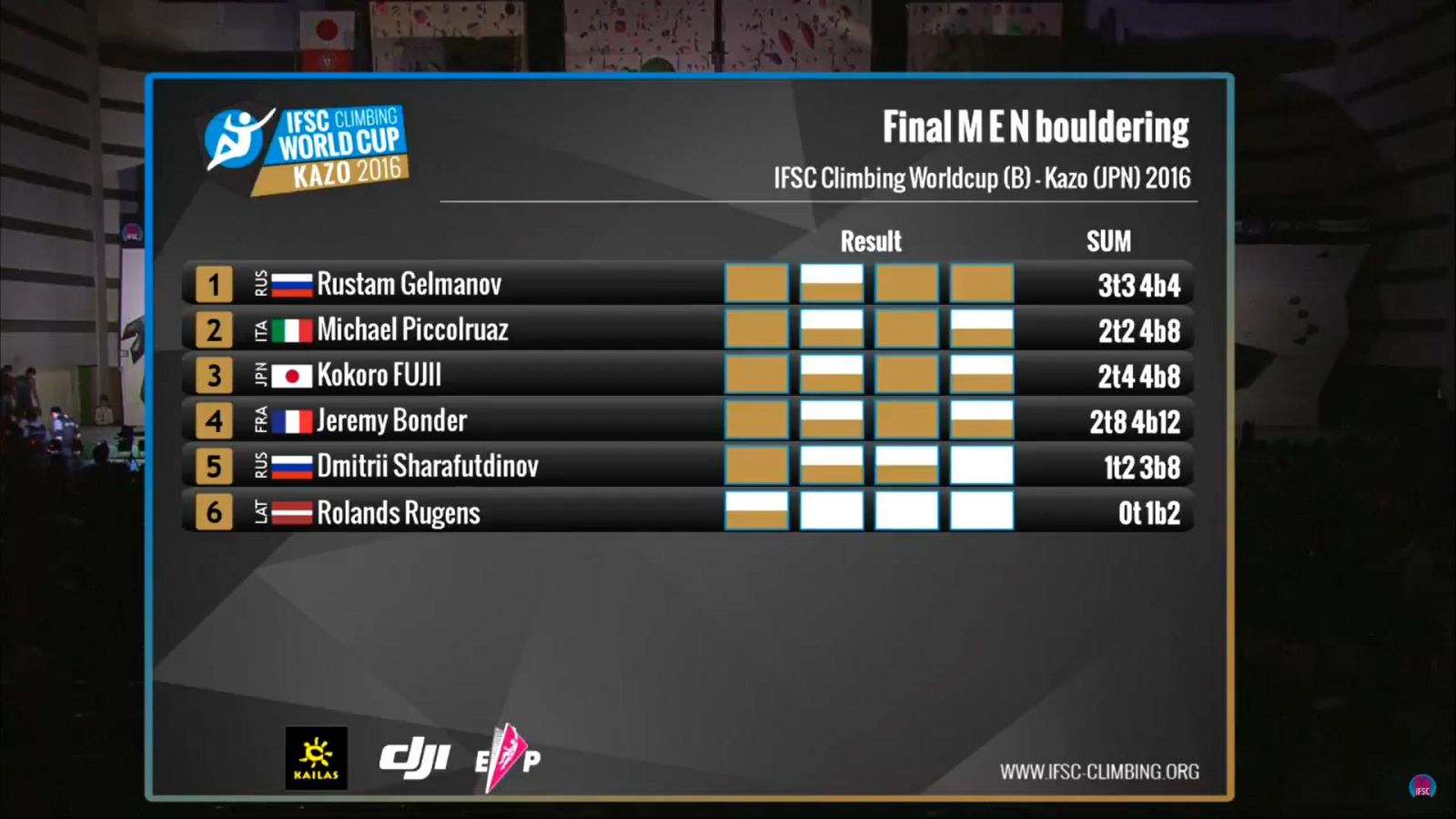 The men’s comp was much more closely contested – so much so that all last weekend’s podium winners didn’t make the finals this weekend! Rustam Gelmanov however, returned to wining way by topping three blocs in three attempts winning the comp by flashing M4. M4, the final men’s bloc was impressive – severely overhanging, it squeezed in all the tricks; volumes, compression moves, double dynos and even a kneebar for those that got that far! Rustam’s win was his first for two years. Italian Michael Piccolruaz came in second with two tops in two attempts and Kokaro Fujji delighted the home crowd with a third place podium position. Once again, lots of big-name men failed to make the cut into the finals proving that the men’s stream is much more open.