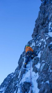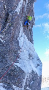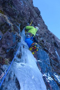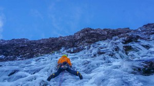 Pitch 2 turned out to be the crucial pitch again. According to Greg; “It was a steep, hanging wall leading to a niche capped by a roof. The wall was smeared with hanging icicles and above the niche there was an ice curtain enticingly hanging over a higher a large overlap.” Greg admits to feeling nervous but having walked-in to the crag on no less than seven previous occasions he felt the time was right to commit; “it was time to step up and give it a shot. But it looked hard, and more to the point, the pitch looked long and sustained.” Greg describes the climbing. “I surmounted the first pedestal and took a deep breath. “No down-climbing this time” I told myself, to try and preserve energy on this monster of a pitch. I started up with every move nudging my thoughts into the correct headspace, and found myself enjoying every second of the experience. I composed myself and tried not to let the technical torques and moves get one arm more pumped than the other. I continued up and then the pump started to sneak in. I was shaking and looking for the next move, shaking and looking, this process went on until I decided to charge for the niche that looked like it would be home to a nice comfortable rest. Unfortunately this wasn’t to be, the routes steepness was deceptive and although the niche wasn’t as steep as the lower wall, it was still well overhanging. I fought to get some gear in and try and de-pump my now burning forearms, deep egyptians and contortions were tried to relive my arms and finally once I had scoped what looked like the way to sanctuary, I powered on through the steep capping roof of the niche to gain a wild and astonishingly exposed position on the overhanging arête. Hundreds of meters of cliff dropping away below me with nothing but air between me and the coire floor. This is a memory that will last a lifetime!”