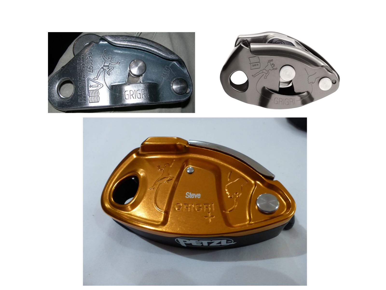 The GriGri family: Original GriGri top left; GriGri2 top right and the GriGri+ centre bottom. Note GriGri+ shown larger for clarity.