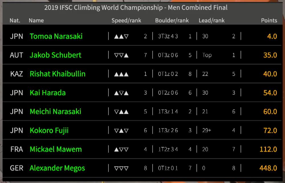 In a high drama event at the World Championships Tomoa Narasaki, Jakob Schubert and speed climbing specialist Rishat Khaibullin respectively took the Gold, Silver and Bronze medals in the Men’s Combined at Hachioji after Alex Megos retired with a finger injury and Adam Ondra fail to qualify.