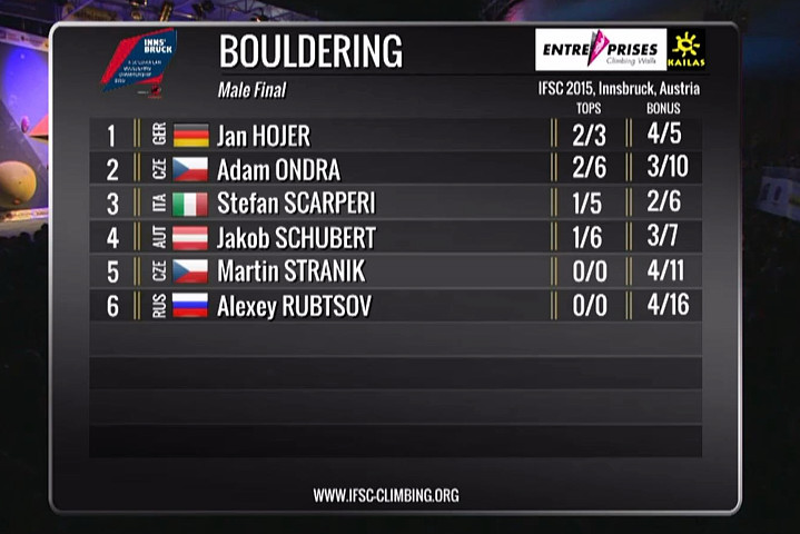 The final men’s placings show the run-away positions by Hojer and Ondra. Screen shot from live stream IFSC