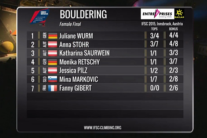 The women’s final placings show just how far the top two women were ahead of the rest of the field. Screen shot from live stream IFSC