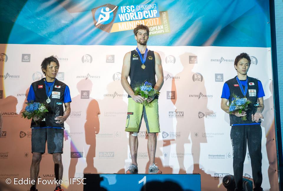 Janja Ganbret and Hans Hojer win Gold at Munich but Shauna Coxsey and Jongwon Chong take the 2017 IFSC WC Bouldering titles.