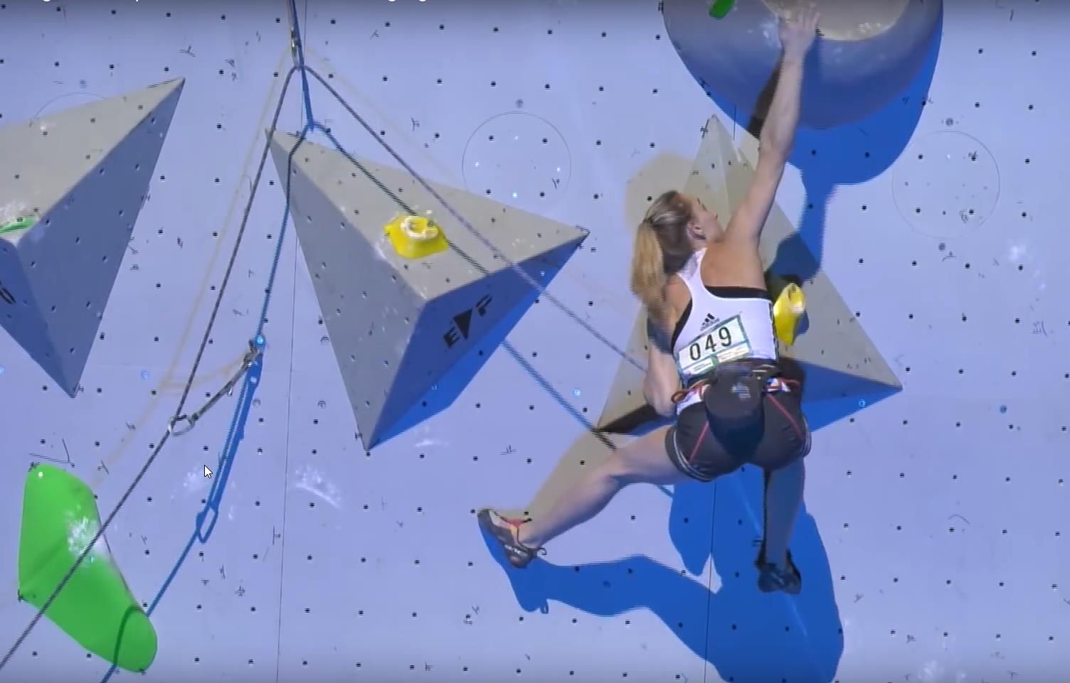 Janja Garnbret cranking high on the final route to collect her first lead gold of the 2018 season.