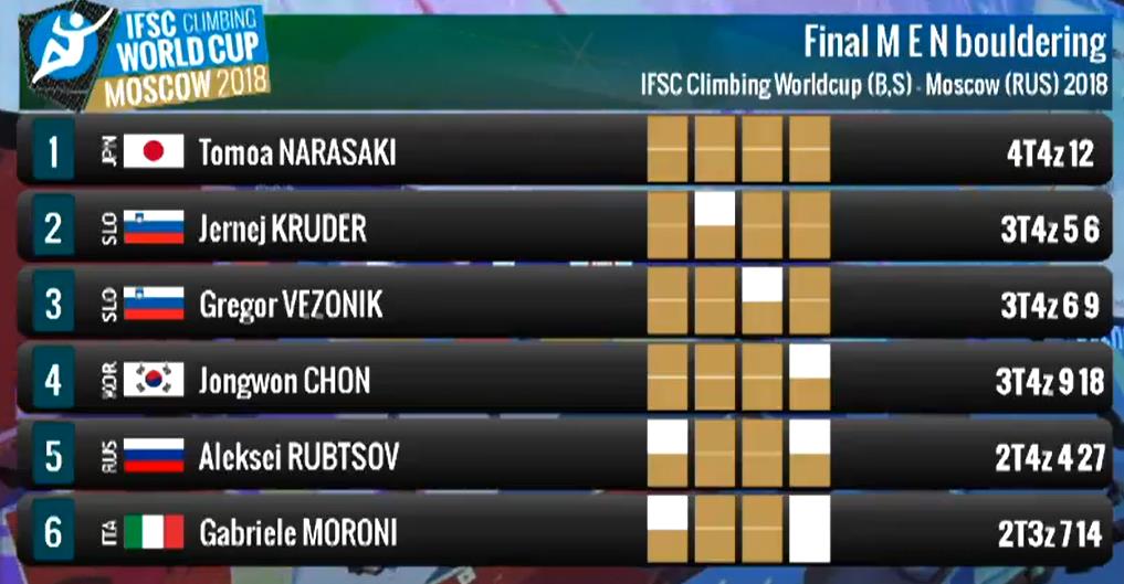 It looked for a while yesterday that Jernej Kruder’s fellow Slovenian, Gregor Vezonik, might well upset the proverbial apple cart given that he was leading the men’s standing at the half-way point in the final – and that on this first every appearance in a WC final! As it was, he slipped back to finish in third, beaten on this occasion by Tomoa Narasaki and Jernej Kruder, but climbing well enough to edge the season campaigner, Jongwon Chon out into fourth. Italian Gabriele Morini was similarily a new name for the men’s finals; he ultimately placed sixth in Moscow but was threatening at one point to upset the big guns having climbed out of his skin all weekend.