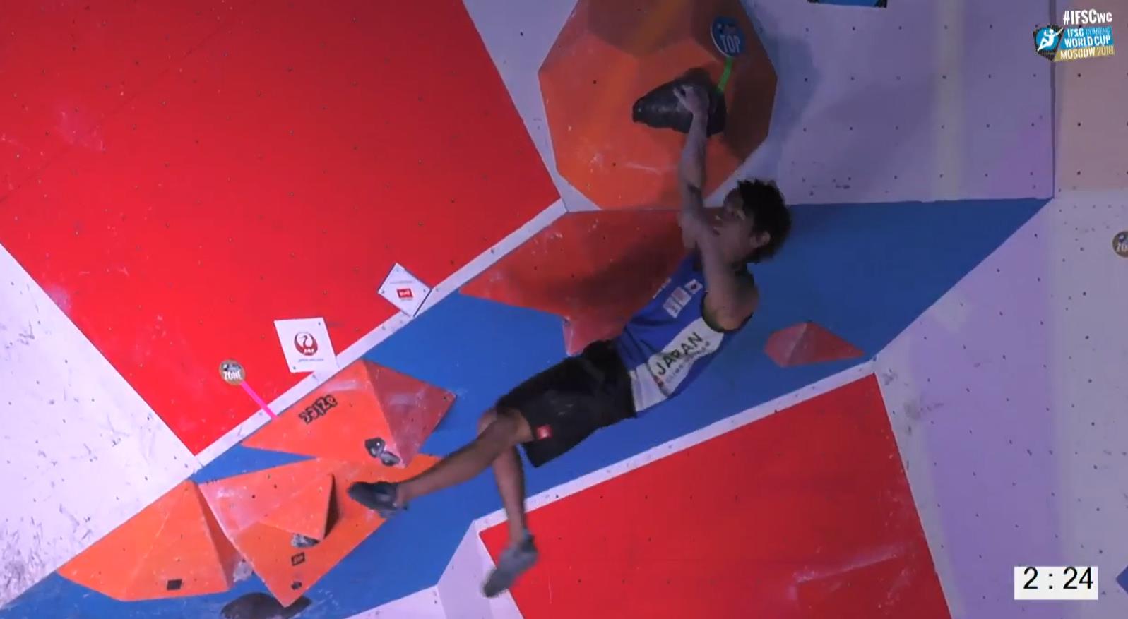 Amidst a plethora of outrageous dynos and tops, the final round of the Moscow leg of the 2108 WC Bouldering closed yesterday leaving the competitors much to think about before the next WC. Posting on social media after the qualification round Shauna commented; “The boulders were pretty old school. Much more basic which was quite cool actually. A nice change if pace.” However, by the final round many of the blocs were seemingly once again back to the new skool, parkour-style bloc setting. Some of the blocs, W2 for example, necessitating multiple dynamic moves in a row. Another, W4, appeared to require a dyno but first Miho Nonaka and then Akyo Noguchi used entirely different beta utilising heel hooks – a sequence that looked more high percentage if more powerful. As competitors de-brief after the event and watch videos of how others tackled the blocs it seems possible that down-stream competitors might keep a more open mind as how to attempt blocs which are seemingly demanding dynos and double moves. Similarly M2 involved a double move that is until Jongwon Chon came out a promptly did the sequence statically.
