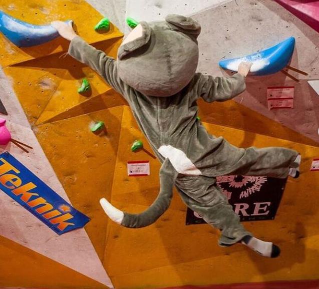 The Beastmaker International Footless Festival, to give the comp its full name, is exactly what the name suggests; a no-holds-barred, fight-to-the-death, footless climbing comp. Following qualification rounds in the autumn at both The Castle and The Climbing Works, all eyes were on The Climbing Works last Saturday for the grand finale. Some of the qualifying contestants rocked-up (pun intended) in costumes as well; Sam Whittaker, one of the directors at The Climbing Works, spend the entire comp dressed in a one-piece cat suit; no, not a slinky high street haute couture jobbie – although that would have been class – but a full-on, its-baking-hot-in-here, animal version!