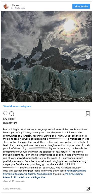 Jim Reynolds (@chimney_jim) IG page on which he outlines his thoughts on his ascent.