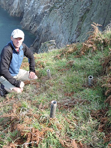 Three large abseil stakes were recently placed on the grass slope above the descent to The Devil’s Chimney Cliff in Jenny’s Cove these have been subsequently removed by climbers on the request of Lundy Warden, Beccy McDonald.
