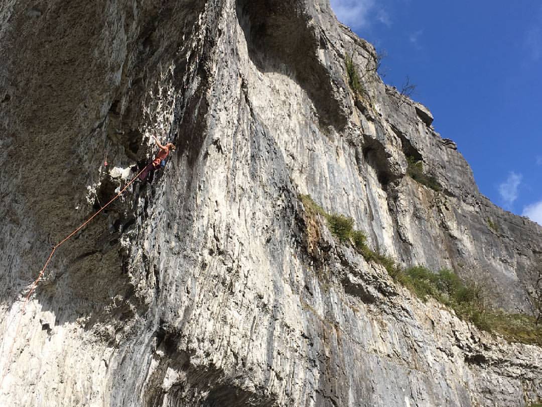 Taking advantage of the (typically) cool bank holiday weather, Madeleine Cope repointed Bat Route (F8c) at Malham yesterday.