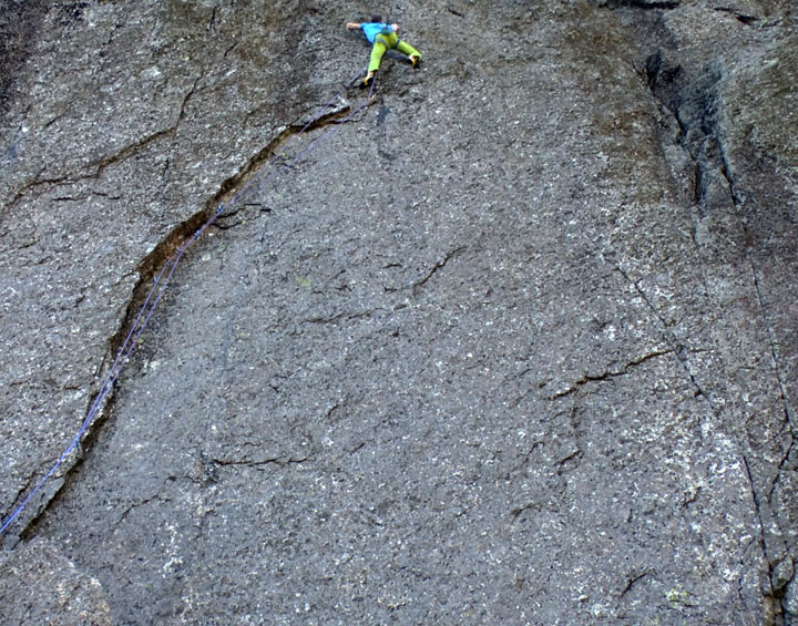 The hard climbing is above Borderline in the overlap feature and it’s so steep here that it doesn’t take any seepage and the line is naturally clean. It’s not the sort of route to have ‘attempts’ on as the only good gear is in Borderline and you’d hit the Ichabod ramp if you come off the move to the peg (which is a very poor blade). You need enough strength in reserve at the peg to back it up with a critical DMM Micro Wallnut 0 (which is hard to place/quiet blind) and then make the final lung for better holds - which is easily droppable.