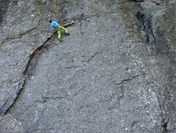 The line takes a natural weakness (an overlap feature) directly up the centre of the East Buttress. It’s incredibly steep on this part of the crag and the climbing involves sustained laybacking on typically unhelpful holds. There is no escape once you commit yourself and the moves don’t ease off until you’re above the overlap. Its F8a climbing on dubious RP protection.