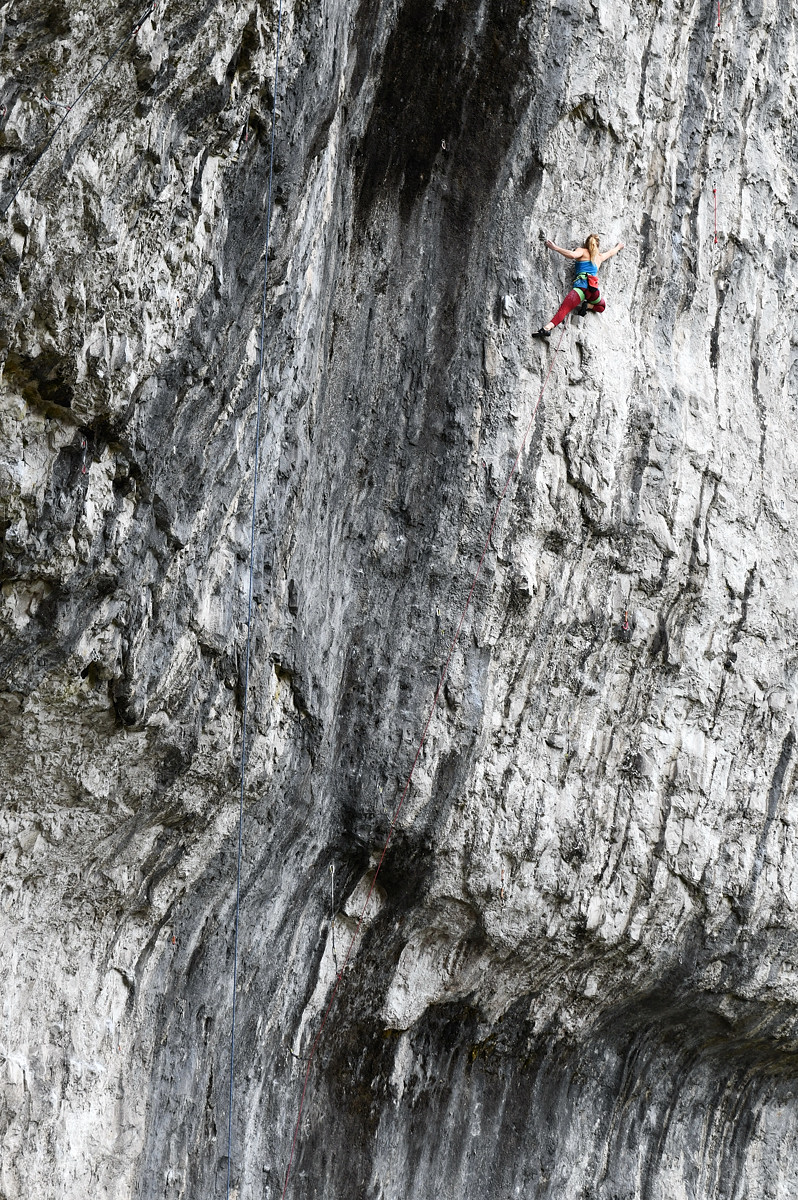Mina Leslie-Wujastyk on the headwall of Totally Free II during her unsuccessful Wednesday burn. Photo: Keith Sharples