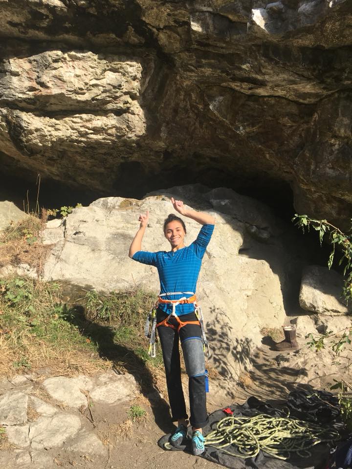 Molly Thompson-Smith standing under Mecca after her speedy repeat of the well-known Peak test-piece. Photo Billy Ridal