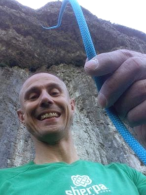 Neil Gresham looking justifiably chuffed apres redpoint with his latest new route Premonition. Photo Neil Gresham/FB Page