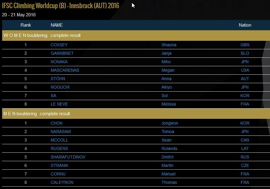 It was Shauna’s fourth gold from the five comps already held this season. She takes a commanding lead into the month-long break before the final two events which start with Vail in mid-June. Over in the men’s comp, the 2015 overall champion, Jongwon Chon, took his first gold of the season.