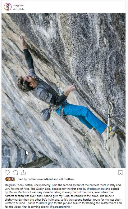 Posting on IG, Stefano had this to say about his second ascent: ‘Today, totally unexpectedly, I did the second ascent of the hardest route in Italy and very first 9b of Arco, The Queen Line, climbed for the first time by Adam Ondra and bolted by Mauro Mabboni. I was very close to falling in every part of the route, even when the hardest section was over, and I had to give my 100% to complete the climb. The route is slightly harder than the other 9b’s I climbed, so it’s the second hardest route for me just after Perfecto Mundo.’