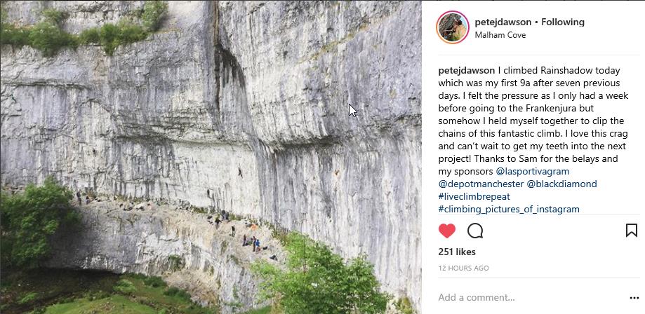 Word from the Catwalk late last night was that Pete Dawson had redpointed Rainshadow (F9a) at Malham.