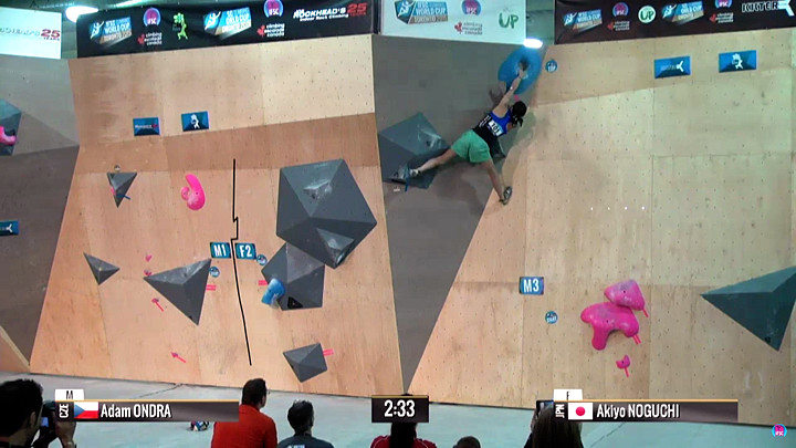 Adam Ondra on his way to dropping the final move on M4 and Alkyo Noguchi about t o start F4 in the finals at Toronto. Video grab from IFSC live feed