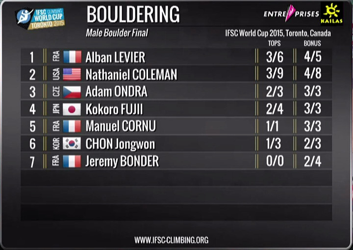 Men’s Results from Toronto. Video grab from IFSC live feed