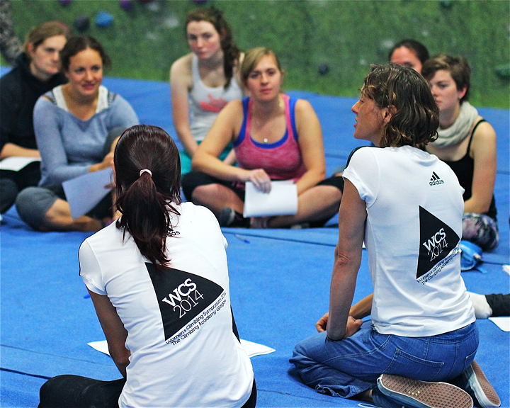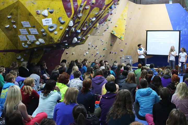 If anyone was reeling from the trauma of having their excuse book ruthlessly shredded, they could find some relief in the slightly gentler ‘Psyche Therapy’ offered by Jenni Stafford-Curtis, a popular workshop that saw 50 or so delegates creatively post-it noting their way to a happier climbing life. A brave selection joined Michaela Tracy and I as we convincingly embodied Buffy and Willow (Champion and Punter) as climbing demon slayers, pinning down fears for a future analytical research model on women’s climbing. The rest were warming up fast to put Hazel’s aphorisms in to practice in the coaching sessions. Confidence, motivation, mind games; climbing grey matters were matched to coloured holds as the 8 top level coaches demonstrated their practical strategies for the climbing brain. From training after pregnancy to headpointing E9, the coaches embodied the breadth of personal focuses that make up women’s climbing.
